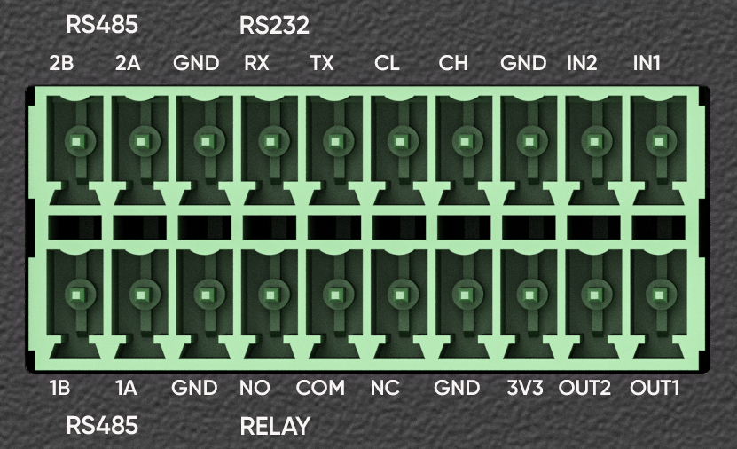 AIBOX 通过凤凰端子提供串行通信接口:RS232 全双工与两路 RS485 半双工。用跳线短接板端 RS232_TX 与 RS232_RX,即可形成自发自收通道。