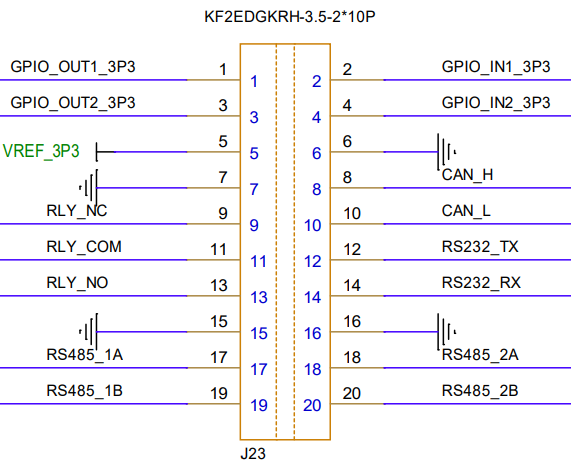 MES20 板载通过 J23 端子对外提供电源、GPIO、CAN、RS232、RS485、继电器触点等信号,全部信号均为 3.3 V 逻辑电平。